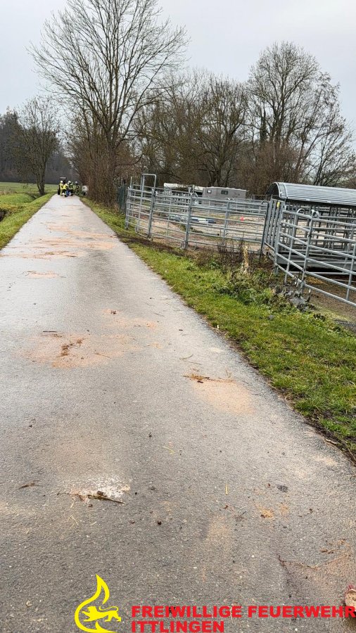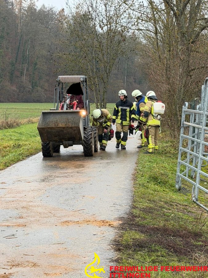 Am Samstag, den 06. Dezember 2025 wurde die Feuerwehr Ittlingen um 13:07 Uhr zu einer Ölspur auf einem Feldweg alarmiert. Vor Ort stellte sich heraus, dass ein Hoflader während des Betriebs Öl verloren hatte, welches sich auf dem Weg verteilt hatte.