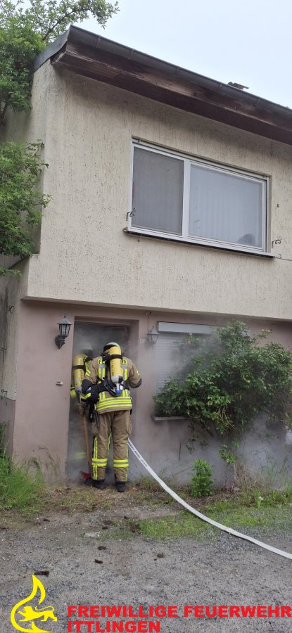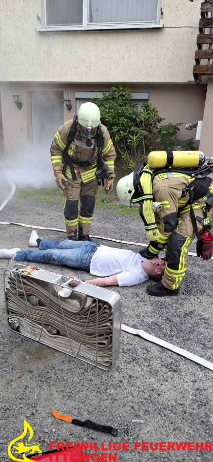 Kurz darauf traf das Tanklöschfahrzeug (TLF 16/25) ein. Dessen Angriffstrupp drang unverzüglich unter schwerem Atemschutz mit einem C-Rohr zur Menschenrettung ins Gebäude vor. Die beiden vermissten Personen konnten zügig lokalisiert und ins Freie gebracht werden. Dort wurden sie mit schweren Verletzungen an das bereitstehende Team des DRK übergeben, das unter der Leitung von Notarzt Dr. med. Joachim Leisen die medizinische Versorgung übernahm.