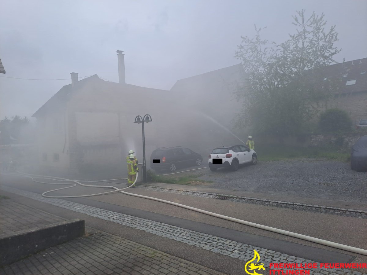 Da die Menschenrettung oberste Priorität hatte, wurde die Brandbekämpfung zunächst zurückgestellt. Infolgedessen breitete sich das Feuer auf den Dachstuhl aus und drohte, auf eine benachbarte Scheune überzugreifen. Umgehend wurden mehrere Löschtrupps im Innen- und Außenangriff eingesetzt. Parallel dazu wurde eine Riegelstellung zur Scheune aufgebaut, bei der auch Kräfte der inzwischen eingetroffenen Löschgruppenfahrzeuge LF 8/6 und LF 8 zum Einsatz kamen.