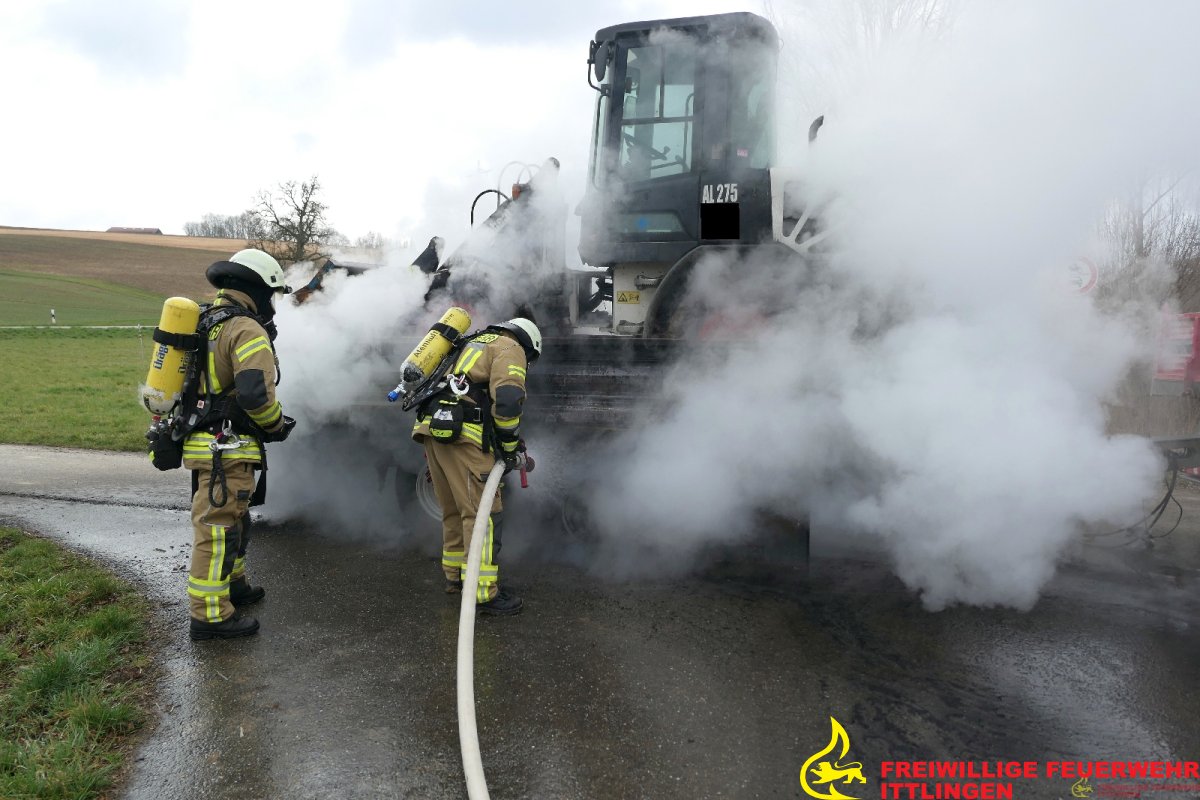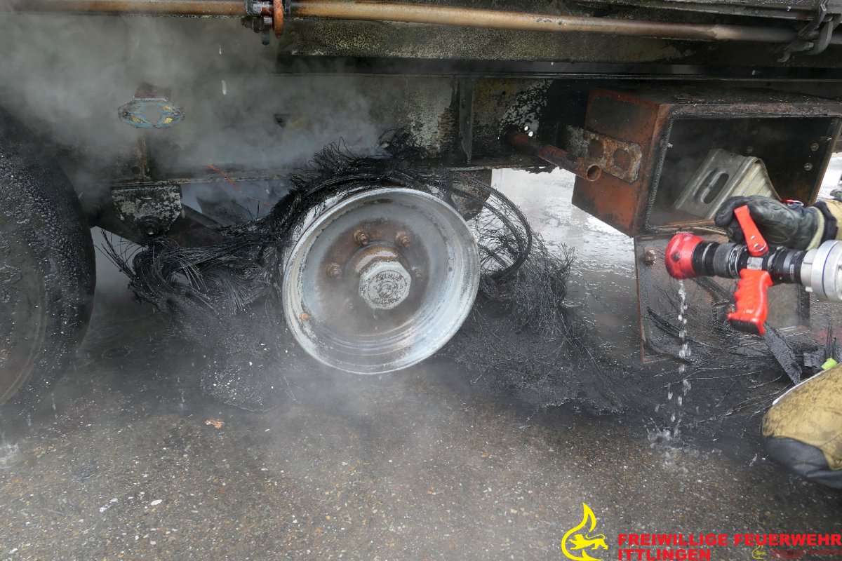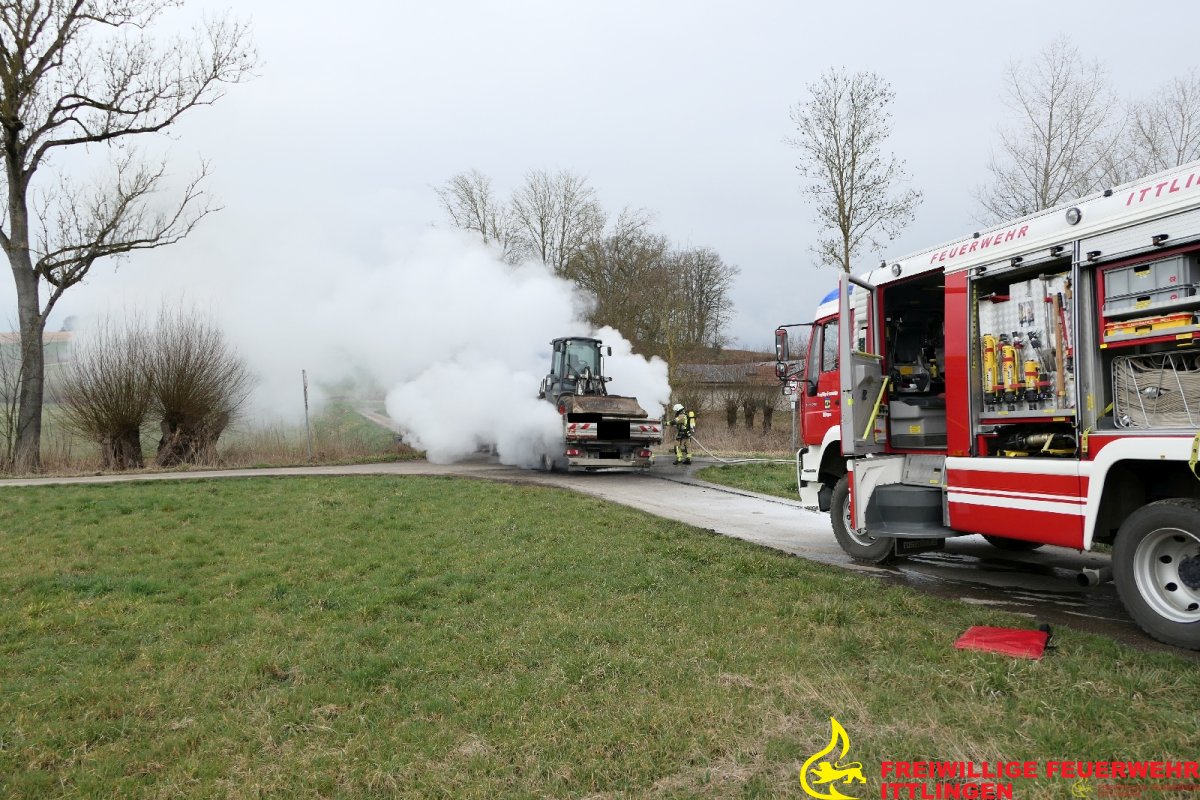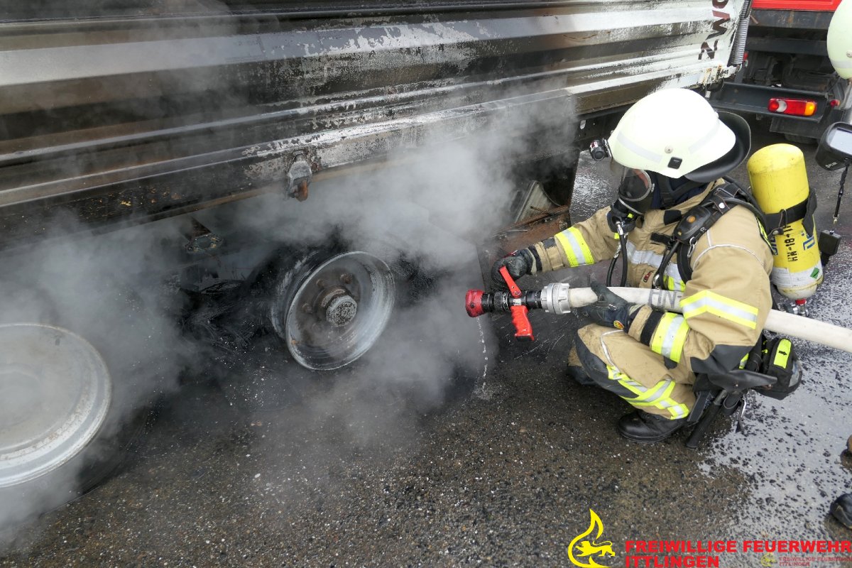 Bei Eintreffen an der Einsatzstelle brannten die Reifen eines Baumaschinenanhängers, auf welchem ein Radlader verladen war. Das Zugfahrzeug war noch angekuppelt. Durch die enorme Wärmeentwicklung bestand die unmittelbare Gefahr einer Ausbreitung des Feuers sowohl auf den Radlader als auch auf das Zugfahrzeug. Der Fahrer hatte das Gespann mit brennenden Reifen von der Landstraße auf den nebenliegenden Radverbindungsweg gefahren. Aufgrund der Nähe zur Elsenz bestand deshalb auch die Gefahr einer Gewässerverunreinigung durch kontaminiertes Löschwasser.