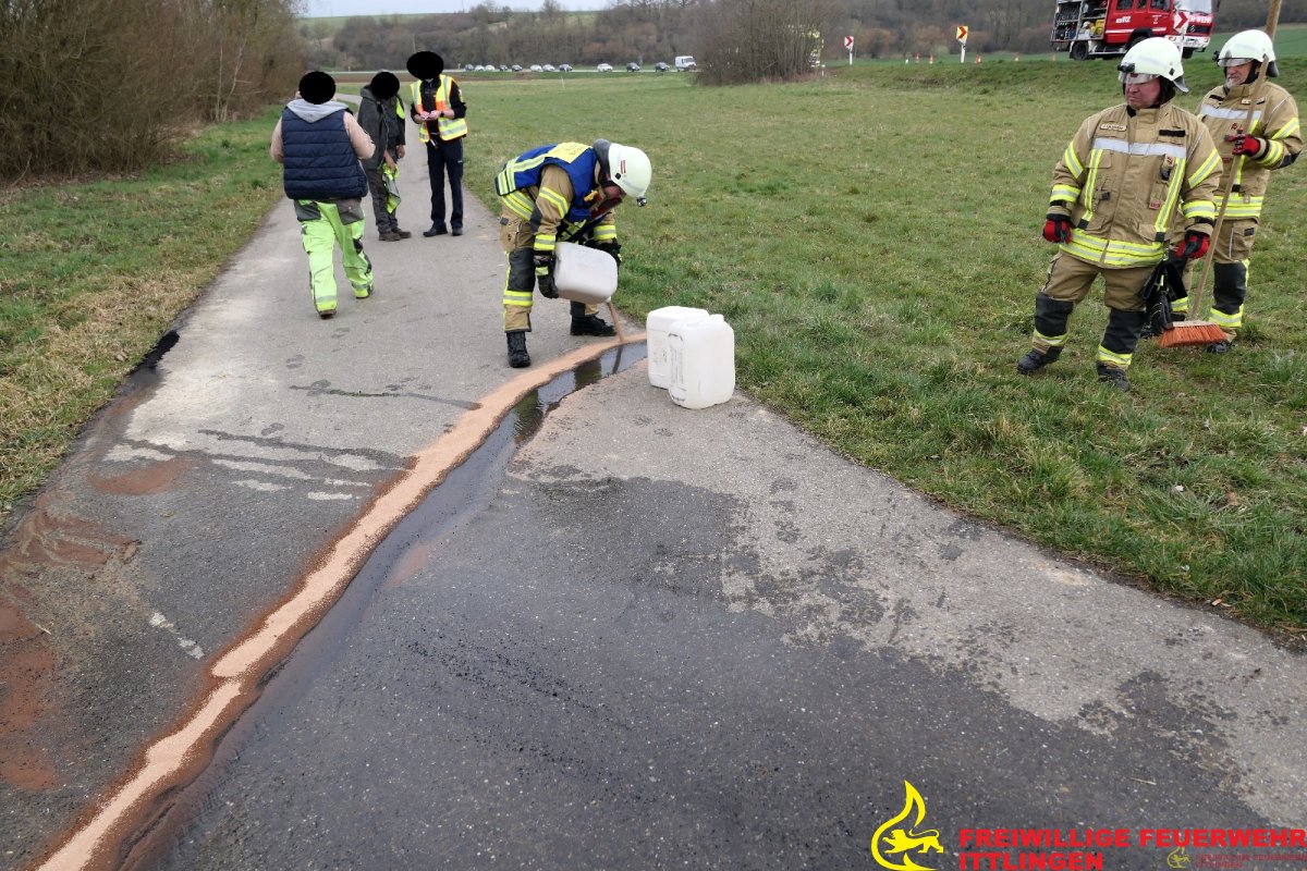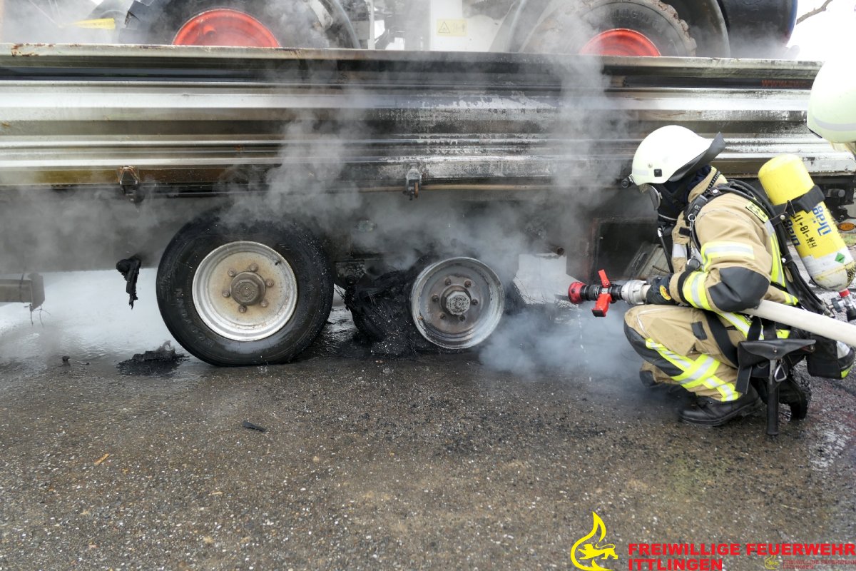 Umgehend wurde ein Trupp unter schwerem Atemschutz mit einem C-Rohr zur Brandbekämpfung eingesetzt und die Einsatzstelle mit Warnmaterial abgesichert. Parallel hierzu wurde mit Ölbindemittel ein Barriere aufgeschüttet, um ein abfließen des Löschwassers in die Elsenz zu verhindern. Die fast zeitgleich eintreffende Streife des Polizeireviers Eppingen sperrte kurzzeitig die Straße, bevor im späteren Einsatzverlauf der Verkehr einspurig an der Einsatzstelle vorbeigeleitet wurde. Nach etwa fünf Minuten Brandbekämpfung war das Feuer unter Kontrolle. Kurz danach platzte mit lautem Knall ein Reifen des stark aufgeheizten Hängers. Nachdem man das Gefährt für einen gewissen Zeitraum weiter mit Wasser heruntergekühlt hatte, konnte die Einsatzstelle an die Polizei übergeben werden.